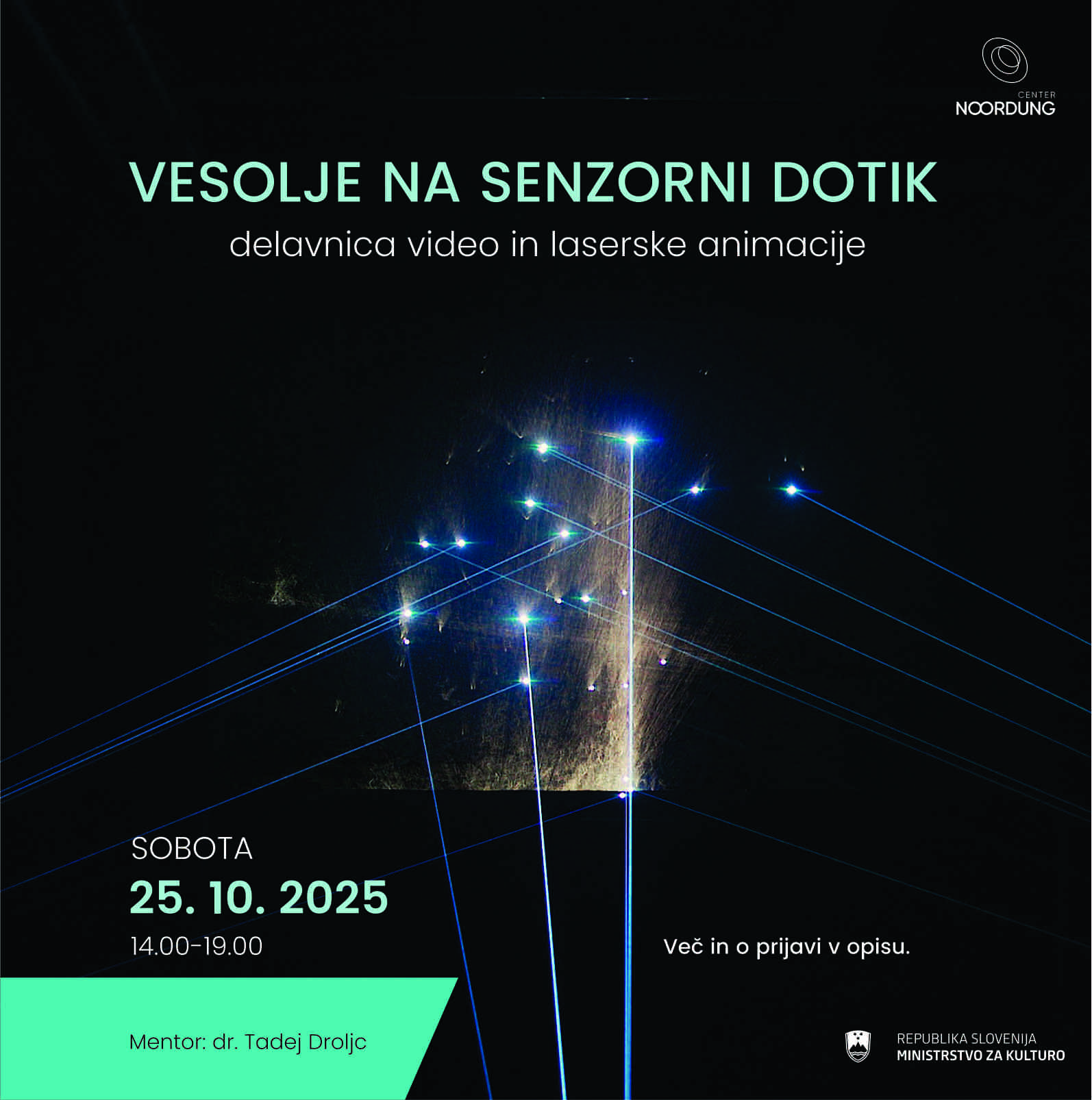 Vabljeni in vabljene k vključitvi v ekskluzivno delavnico video in laserske animacije »Vesolje na senzorni dotik«. Vstopite v preplet uporabe tehnologije in umetniških pristopov ter ustvarite več-senzorno izkušnjo nočnega neba.
